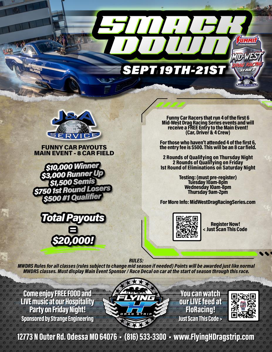 TULSA, OKLAHOMA – (March 7, 2024) The Summit Racing Equipment Mid-West Drag Racing Series, along with Flying H Drag Strip are pleased to announce the largest payout ever in pro mod racing with the inaugural Fall Smackdown at the brand-new facility in Odessa, Missouri, from September 19th to 21st, 2024.