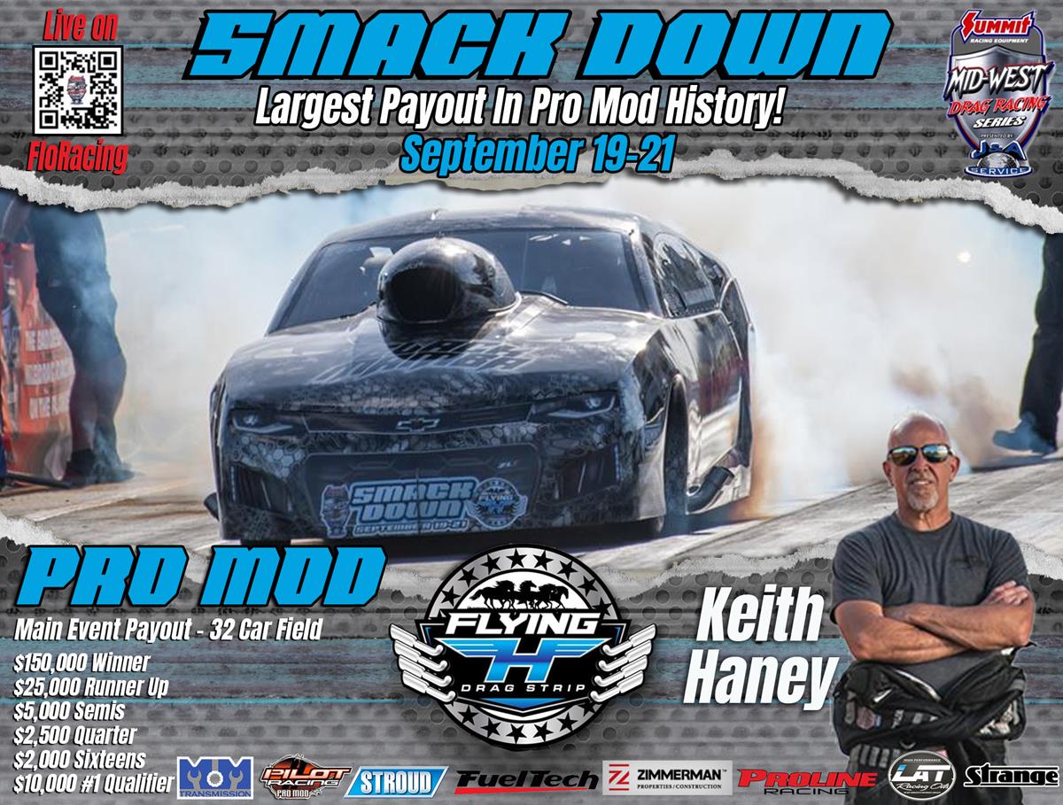 Defending Mid-West Drag Racing Series Pro Mod Champion Keith Haney is bringing all of the nitrous to Flying H Drag Strip for the Smack Down 2024 - Largest Payout in History! His Camaro has an event win this season and he intends to use that momentum to take home the $150,000 Winners Payout!