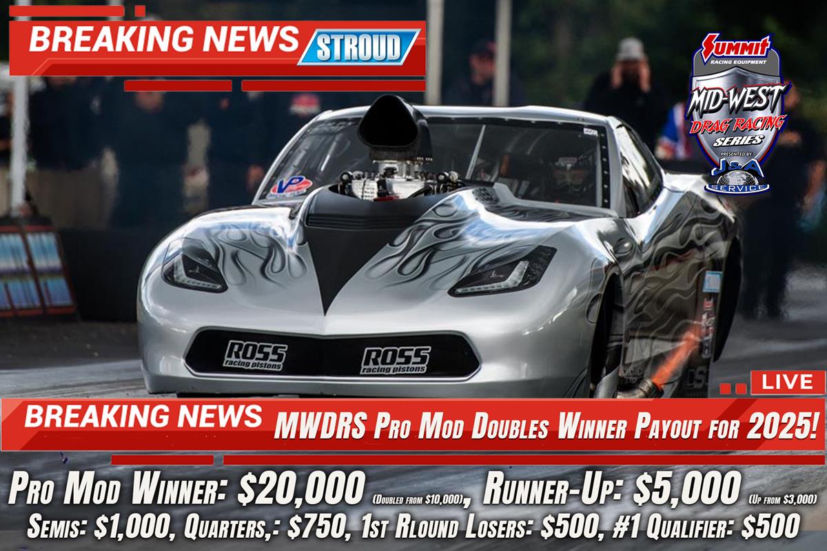 The Mid-West Drag Racing Series is thrilled to unveil a HUGE payout increase for the Stroud Safety Pro Mod Class in 2025, all made possible by our amazing Marketing Partners! This will DOUBLE the Winner Payout for EACH MWDRS event in 2025!