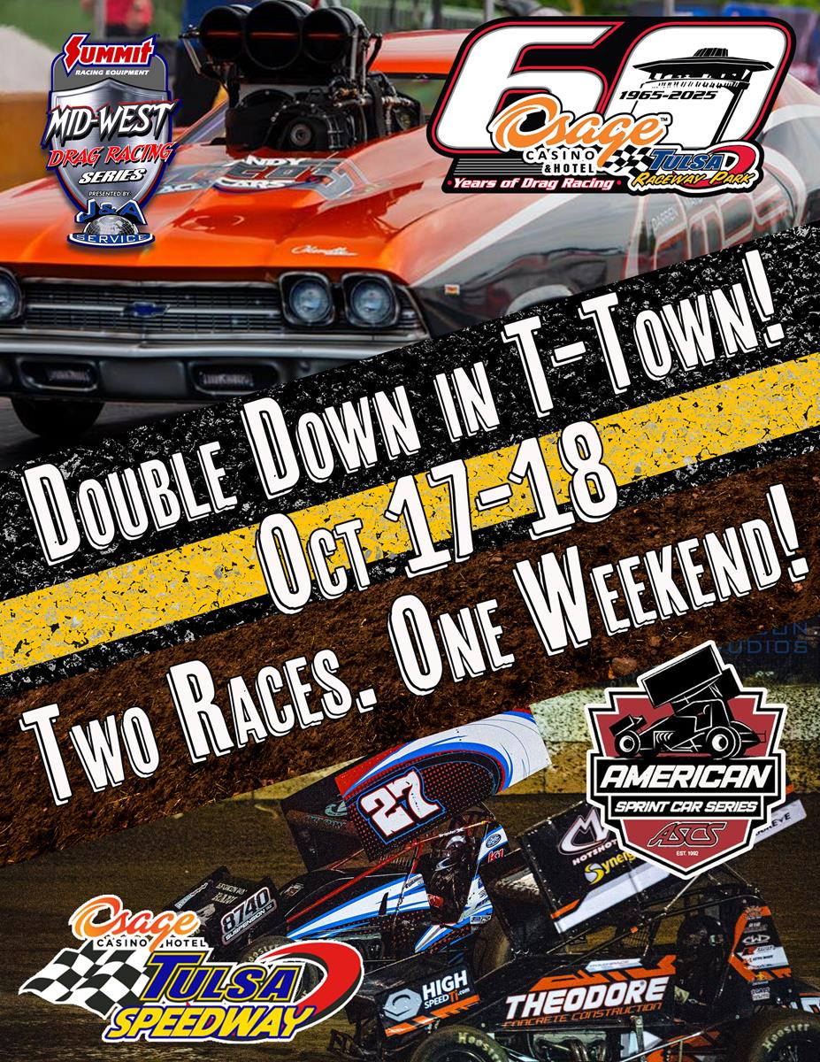 Osage Casino & Hotel Tulsa Raceway Park (TRP) and Tulsa Speedway (TSW) are joining forces once again to create an unmatched weekend of motorsports when the Throwdown in T-Town/Ronnie Hobbs World Finals collides with Dirt Down in T-Town, Oct.?17-18 to create the FIRST EVER Double Down in T-Town! Fans enjoy free general admission to both venues, with a single $25 per-vehicle parking pass (per day) unlocking access to every burnout, high-speed dirt slinging slide, and side-by-side duel on the property.