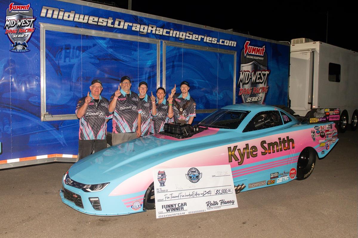 In J&A Service Funny Car, it was an amazing night for Kyle Smith, as he took home his first MWDRS Victory with a stout 3.644s run over Robbie Massey. Massey made Smith work for it, as he ran a 3.67s run in the beautiful evening air on Saturday night in Kansas City. Smith becomes the 12th first-time winner in MWDRS competition this season with the run. Kyle will throw himself into the mathematical hunt for the Funny Car Championship thanks to some help from Massey, who eliminated the always quick Jim Whiteley in the second round.