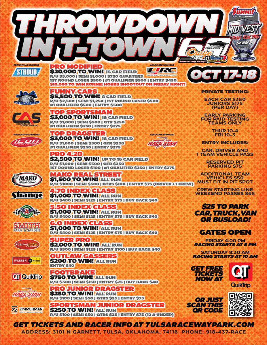 We writing to share some exciting news about an upcoming motorsports event in Tulsa! Osage Casino & Hotel Tulsa Raceway Park (TRP) and Osage Casino & Hotel Tulsa Speedway (TSW) are teaming up for "Two Tracks. One Epic Weekend!" This event, combining "Throwdown in T-Town" and "Dirt Down in T-Town," will offer two nights of non-stop action on October 17-18.